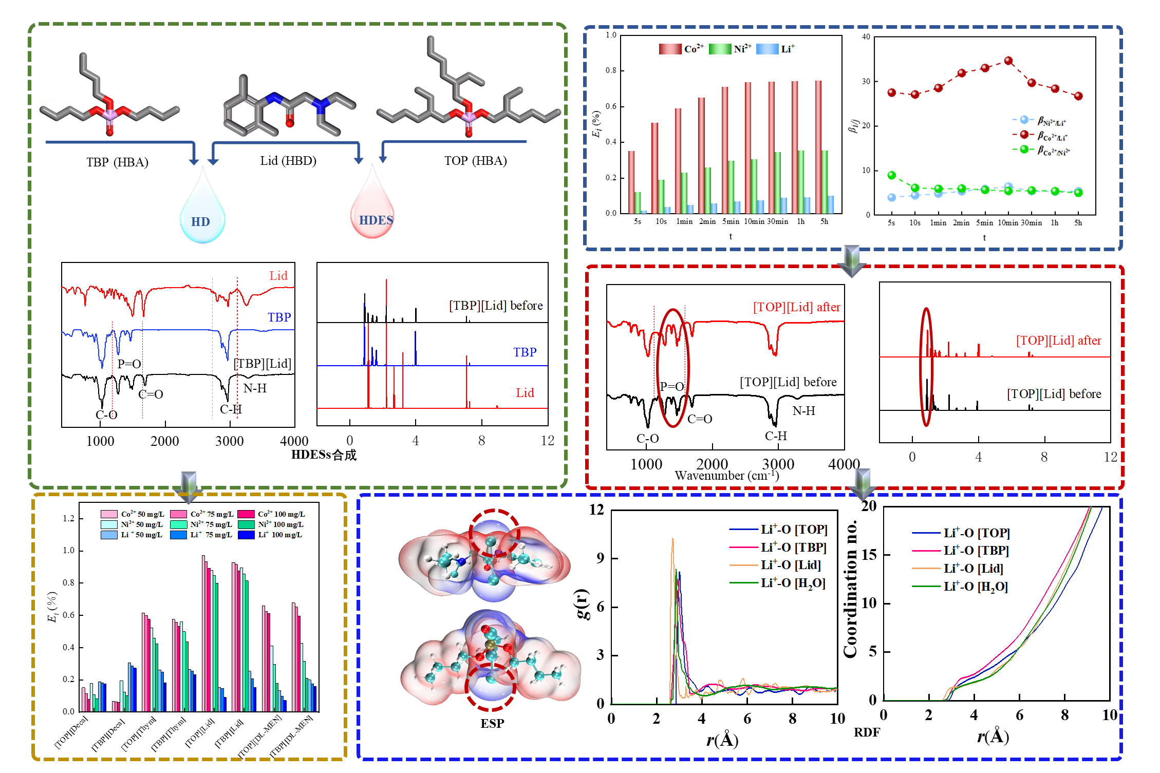 研究团队通过选择不同的氢键供体(癸酸、利多卡因、DL-薄荷醇和百里香酚)与氢键受体(磷酸三丁酯和磷酸三辛酯),合成了一系列HDES。经过探索性实验,筛选出了适用于LIBs正极材料中有价金属回收的HDES。通过傅里叶变换红外光谱(FT-IR)和核磁共振氢谱(¹H NMR)表征,确认了氢键供体(HBD)与氢键受体(HBA)之间的氢键作用。静电势分析(ESP)显示,氢键的形成主要是由Lid(HBD)中的N-H键与TOP(HBA)中的P=O键相互作用,进一步验证了HDES的成功合成。