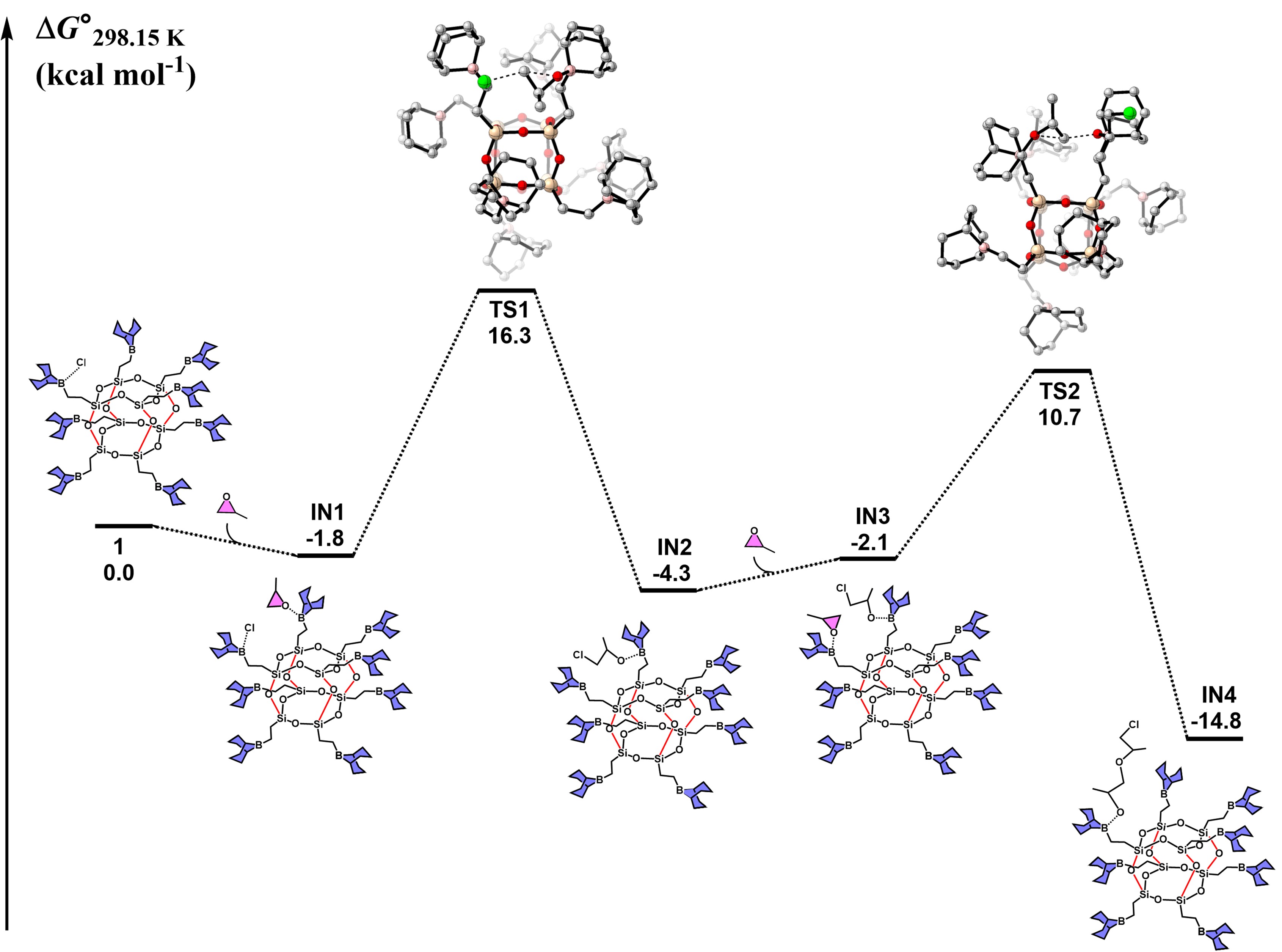 图4.POSS-B8催化PO开环聚合的关键中间体及过渡态的吉布斯自由能分布示意图