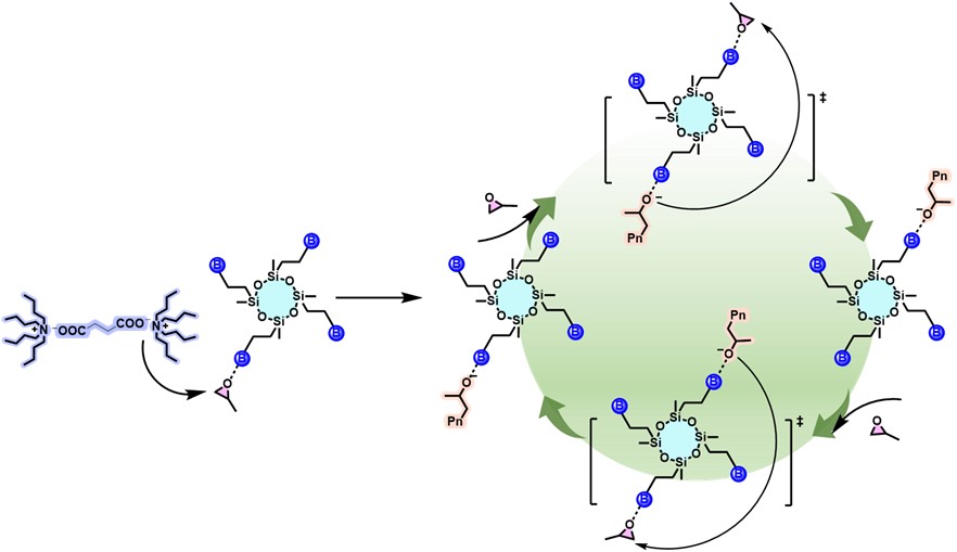 化工学院王晓武教授、李志波教授在官能化有机硼(ACS Catal.2022,12, 8434–8443;Polym. Chem.,2022,13, 6551-6563)合成及其在开环聚合(Macromolecules2023,56, 4030–4040)、共聚合(Chin. J. Polym. Sci.2023,41, 735–744;Polym. Chem.2024,15, 2476-2481)的研究中取得了一系列成果。进一步地,他们合成了高度耐水氧的大分子硼(Angew. Chem. Int. Ed.2024,63, e202318645)实现了环氧单体的高效均聚和环氧单体与CO2的高效共聚。前期研究表明,硼Lewis酸的个数及键合的共价骨架对有机硼的活性、可控性、耐水氧性及聚合单体的种类、聚合反应类型至关重要。但受限于大分子骨架的结构不够明确,目前缺乏一类结构明确的共价骨架将游离的有机硼通过整合策略合成多核硼Lewis酸并研究其构-效关系。多核有机硼中,多位点的硼中心之间及其与骨架的相互协同,为提升多核硼的催化性能提供了保障。因此,在前期工作的基础上,他们合成了结构明确的Si-O-Si共价骨架键合的多核硼Lewis酸,通过调控Si-O-Si共价骨架的结构,实现了环氧单体的高效开环聚合以及高附加值聚醚多元醇的高效合成,并提出了新的催化模型,为新型多核硼的合成、催化机制及应用开辟了方向。
