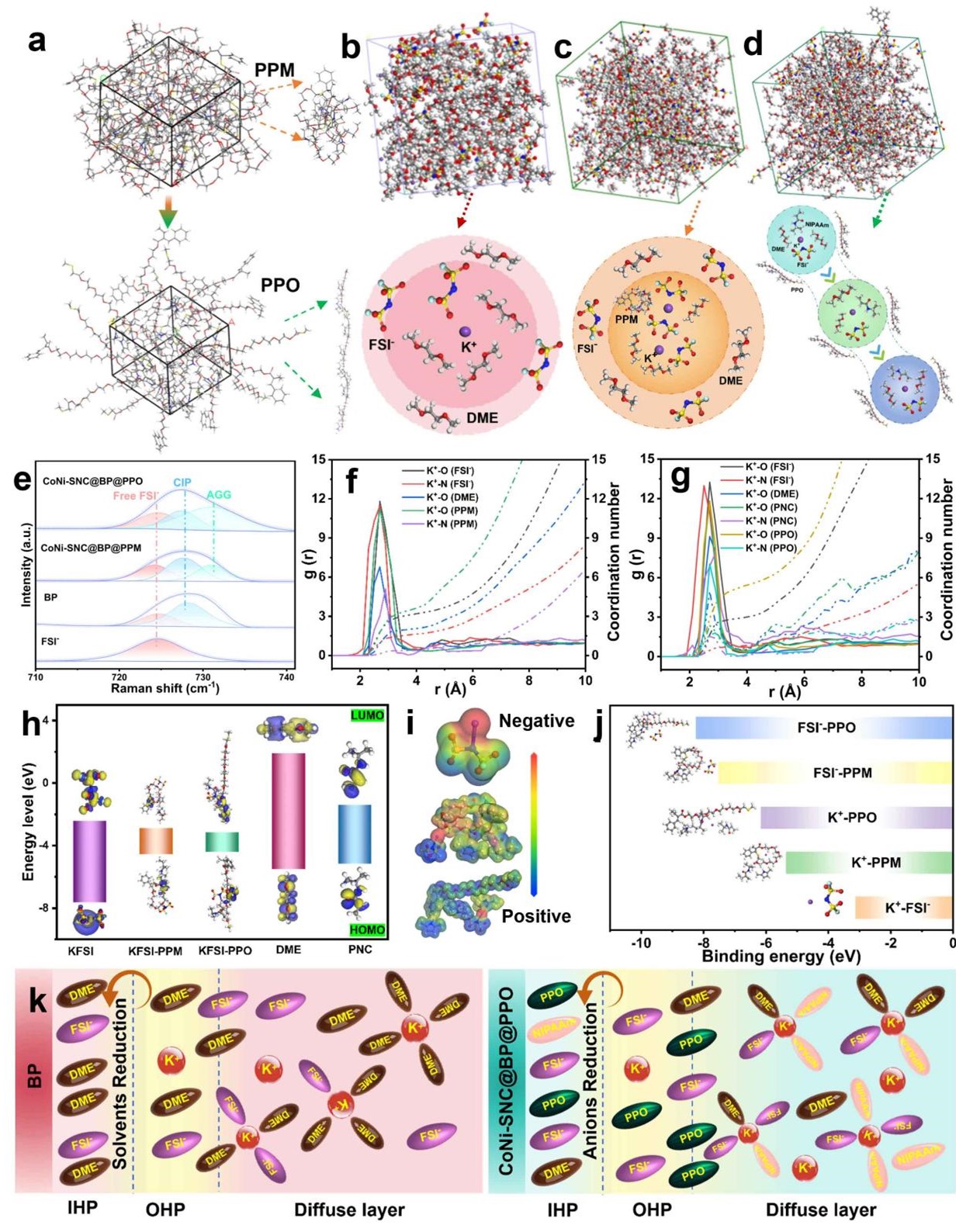 图2. a)从PPM向PPO转变过程缠绕/解缠模型示意图。b) BP,c) CoNi-SNC@BP@PPM,d) CoNi-SNC@BP@PPO的分子动力学(MD)模拟快照。e)基于BP复合物的电解液的拉曼光谱。K+与f)不含PNC的电解液,g)含PNC的电解液的配体的配位行为。h)各组分的轨道能级,i)各组分的静电势分布图,j)各组分的结合能和构型,k) BP与CoNi-SNC@BP@PPO的电双层电容(EDL)对比。