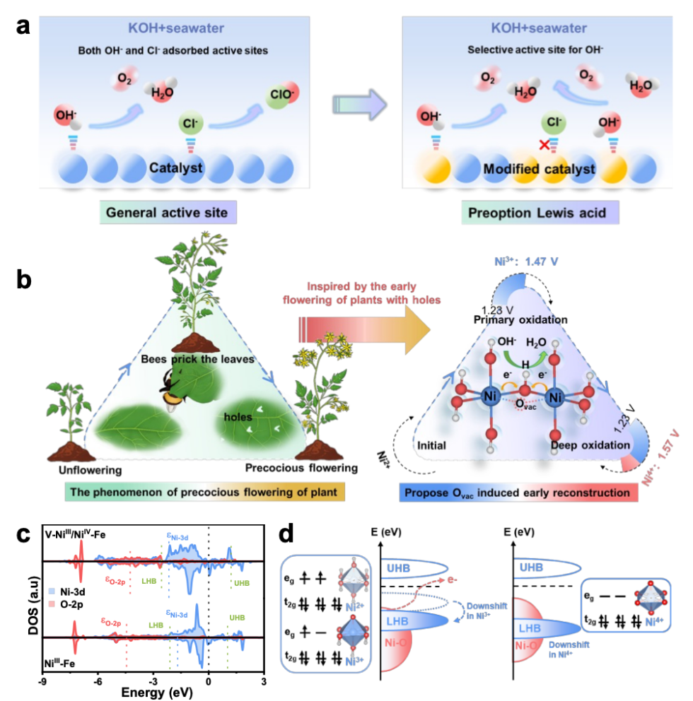 研究团队受植物叶片损伤后提前开花现象的启发,提出了一种氧空位“催熟”机制,成功设计出富含氧空位的镍基催化剂(V-NiⅡ-Fe)。通过理论计算和实验验证,揭示了氧空位在加速Ni2+→Ni3+→Ni4+转化过程中的关键作用。氧空位能够调控局部电荷分布,降低氢质子脱附能垒,促进高价位Ni4+的形成。Ni4+作为硬路易斯酸,对OH-表现出强选择性吸附,有效避免了Cl-的竞争和腐蚀。实验表明,该催化剂在1.0 M KOH+海水电解液中仅需333 mV的过电位即可实现1.0 A cm-2的电流密度,并在碱性海水阴离子交换膜(AEM)电解槽中稳定运行超过200小时。此外,团队通过原位表征技术证实了Ni4+的存在及其在析氧反应(OER)过程中的高效催化活性。结合技术经济分析,该催化剂制备方法简单、成本可控,每公斤氢气生产成本低至0.93美元,远低于美国能源部2026年的目标,展现出显著的经济和环境效益。