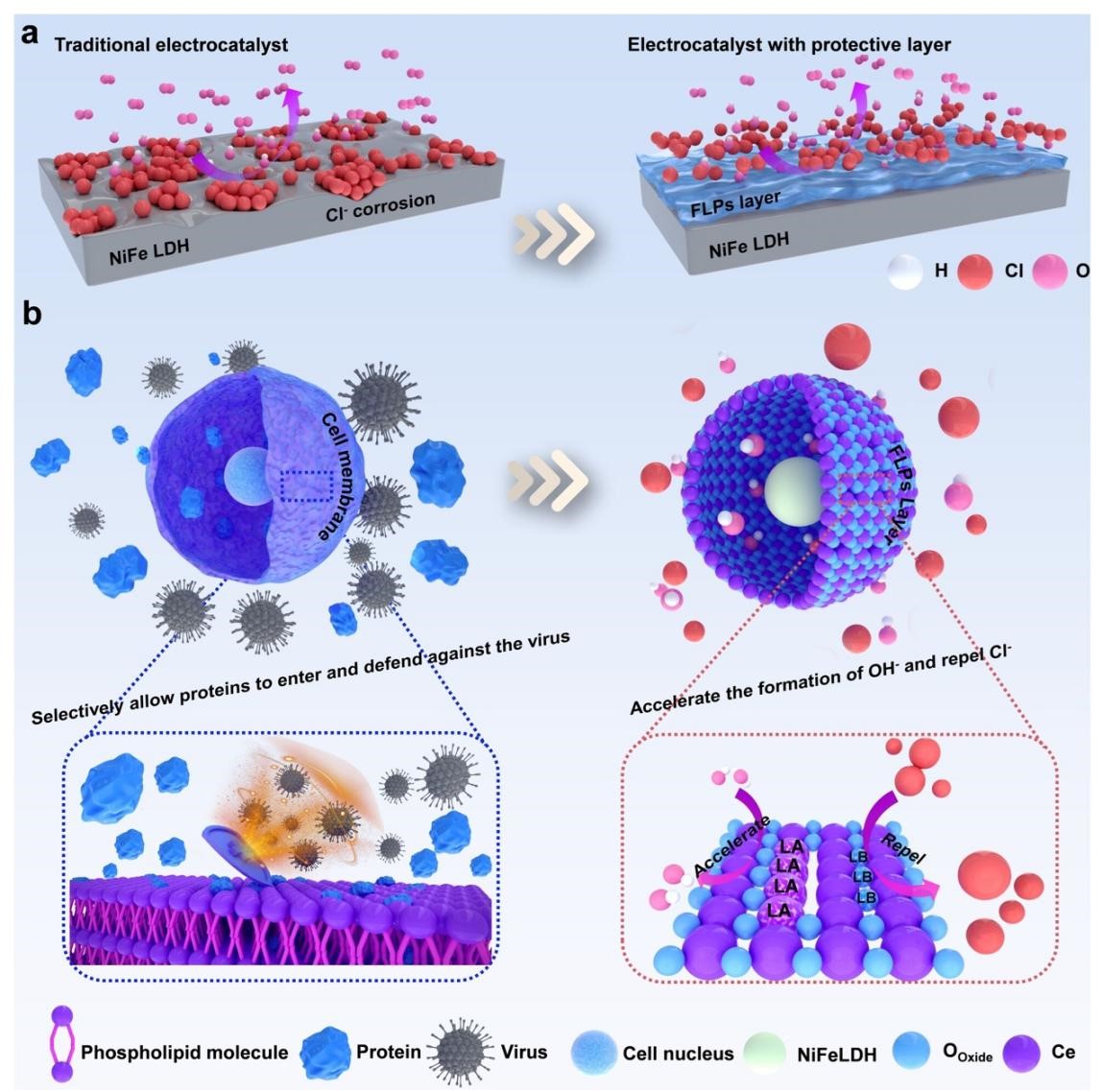 在“双碳”战略深入推进的当下,氢能作为未来清洁能源体系的重要支柱,正迎来前所未有的发展机遇。海水电解制氢,被视为破解淡水资源紧缺、加快绿色能源布局的关键路径。然而,海水中的氯离子作为“隐形杀手”易引发氯副反应并腐蚀催化剂,使传统催化剂在海水环境中效率低、稳定性差,成为制约产业化的技术瓶颈。面对这一挑战,近日,万象城allwincity官网迟京起副教授、王磊教授在国际顶级期刊Angew. Chem. Int. Ed. 2025, e202511867、Angew. Chem. Int. Ed. 2025, 64, e202414721上分别发表了题为“Bionic Design of Ni4+Lewis Acid Site Based on Selective Seawater Oxidation”和“Frustrated Lewis Pair Mediated f-p-d Orbital Coupling: Achieving Selective Seawater Oxidation and Breaking *OH and *OOH Scaling Relationship”的研究论文,两项研究通过仿生设计,成功开发出高活性、耐腐蚀的仿生结构催化剂,显著提升了海水电解制氢的效率和稳定性,为绿色氢能经济的发展提供了新思路。