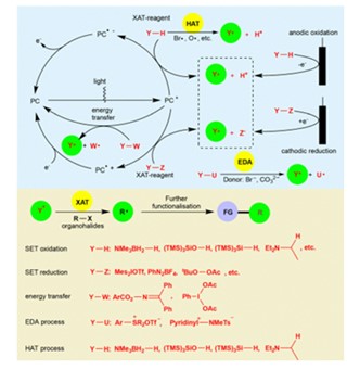 相较于紫外光激发、键的均裂及单电子还原等传统卤代烃脱卤产碳自由基策略,XAT途径可有效克服有机卤化物碳—卤键(高还原电位和高解离能(BDE))的固有挑战,实现在温和反应条件下对惰性碳–卤键的高效活化。该策略不仅拓宽了可参与转化的官能团适用范围,还显著提升了官能团耐受性。此外,通过引入多样化官能团,能够精准调控XAT过程中自由基物种的亲核性;而借助对含多官能团XAT介质的选择性氧化或还原,可实现自由基物种的可控生成。基于此,自由基物种能与有机卤化物实现更优的反应匹配性,进而高效驱动目标碳自由基的形成,最终完成有机卤化物的高选择性转化。