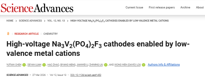 3月27日,万象城allwincity官网机电工程学院刘治明教授团队在Science Advances期刊发表题为“High-voltage Na3V2(PO4)2F3cathodes enabled by low-valence metal cations(低价金属阳离子构筑的高电压Na3V2(PO4)2F3正极材料)”的研究论文。