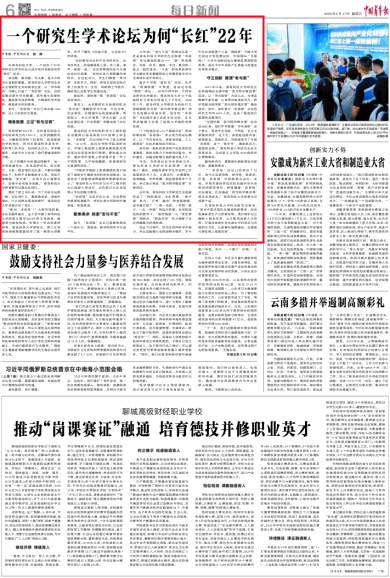 5月17日,《中国青年报》第6版头条以《一个研究生学术论坛为何“长红”22年》为题,从“精准施策,立足‘有与没有’”“聚焦需求,探索‘变与不变’”“守正创新,厘清‘老与新’”三个方面,报道了学校“求思得”论坛创办22年来的组织开展情况,以下为报道全文: