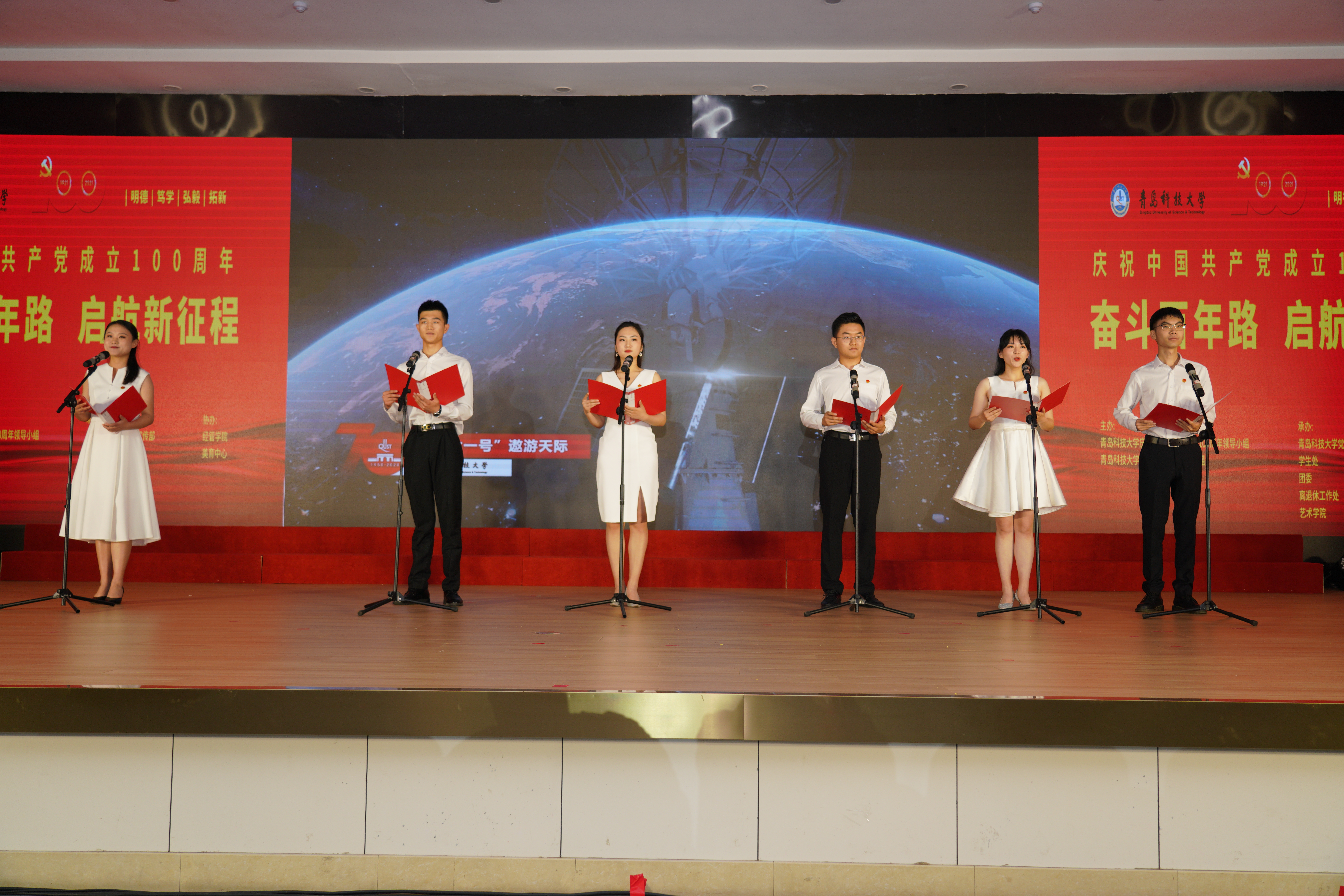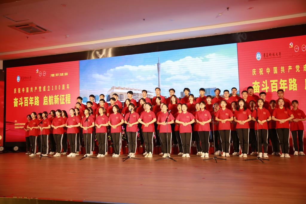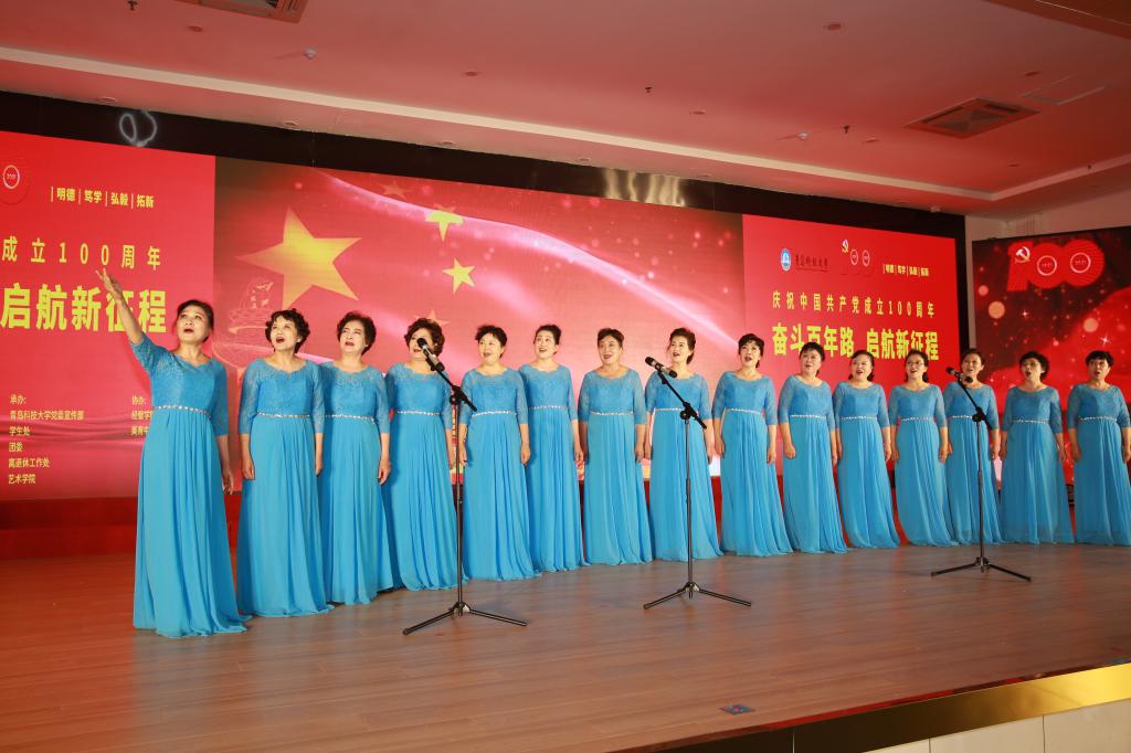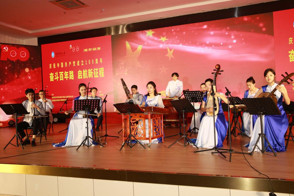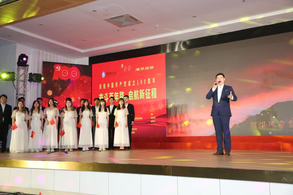 《保卫黄河》《我和我的祖国》《映山红》《妈妈教我一支歌》《绣红旗》《献给党的的歌——中国红色名曲联奏》《走向复兴》《颂歌》《百年征程正芳华》等一首首经典红歌、名曲、诗段,表达了师生们对祖国的美好祝愿、对党的赞美和永远跟党走的坚定信念。艺术学院带来的原创歌曲《百年誓言》唱出了共产党员面向党旗读出誓言,就是一生的承诺与坚守的坚定信念。最后全体演职人员与现场领导、师生齐声共唱《没有共产党就没有新中国》,向伟大的中国共产党献上诚挚的祝福。