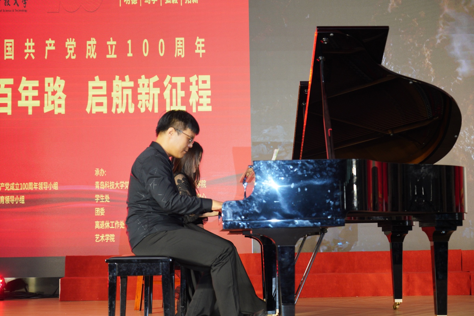 本次音乐会由学校庆祝中国共产党成立100周年领导小组、党史学习教育领导小组主办,党委宣传部、学生处、团委、离退休工作处、艺术学院承办,经济与管理学院、美育中心协办。音乐会通过搜狐、澎湃网络直播平台同步直播,青岛、高密、济南三地五校区师生观看了演出,两平台观看点击量达到130余万。