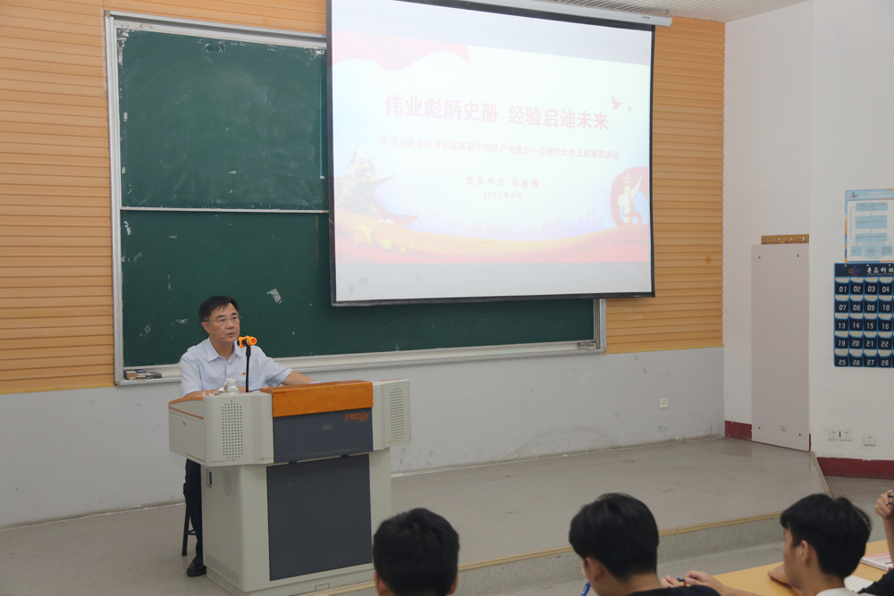 马连湘从“一个大事、四个阶段、一个精神、九个必须、三个要求”五个层面,结合党史中的重大事件和党带领中国人民为实现中华民族伟大复兴不懈奋斗的历史进程,深入浅出、生动形象地带领同学们一起学习了习近平在庆祝中国共产党成立一百周年大会上的重要讲话精神,切实推进讲话精神进课堂、进头脑。马连湘指出,100年来中国共产党弘扬“坚持真理、坚守理想,践行初心、担当使命,不怕牺牲、英勇斗争,对党忠诚、不负人民”的伟大建党精神,带领中国人民披实现了从不挨打、不挨骂到不挨饿的巨大进步,带领中华民族实现了从站起来、富起来到强起来的伟大飞跃,全面建成了小康社会,实现了第一个百年奋斗目标,这是中华民族的伟大光荣,是中国人民的伟大光荣,更是中国共产党的伟大光荣,在中华民族的发展历史进程中具有重要意义。马连湘表示,只有看清楚过去我们为什么能够成功,才能弄明白未来我们怎样才能继续成功,以史为鉴、开创未来,我们要认真学习百年党史,充分汲取奋进力量。今天,我们已经发展成为具有重大全球影响力的世界第一大执政党,未来,我们必须继续为实现人民对美好生活的向往不懈努力,努力为党和人民争取更大光荣!