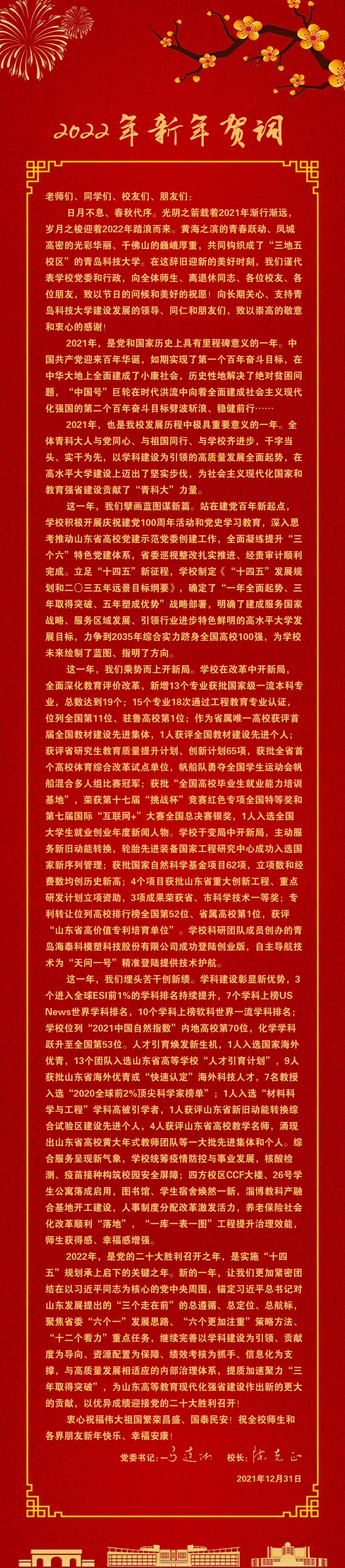 党委书记马连湘、校长陈克正致2022年新年贺词