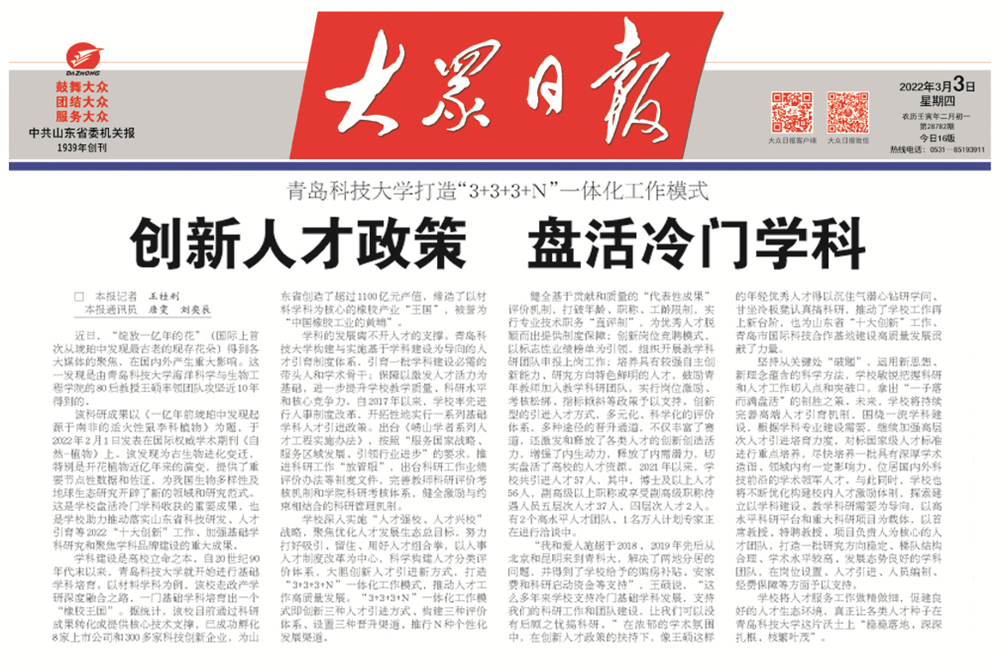 3月3日,《大众日报》教育版头条以《万象城allwincity官网打造“3+3+3+N”一体化工作模式——创新人才政策 盘活冷门学科》为题,详细报道了学校人才政策创新相关工作,全文如下: