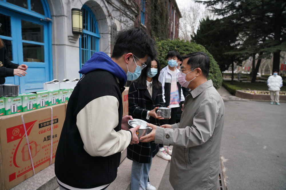 由于属地疫情防控要求暂时取消堂食,为保障学生们用餐便捷安全,学校集中为全体科大学子采购了不锈钢餐盒。3月18日上午,党委书记马连湘、校长陈克正代表学校为在校学生配发了近3.4万套防疫爱心餐盒,让同学们在惊喜之余收获了满满的感动。全体辅导员入住学生宿舍,及时了解同学们的诉求,变身为思想减压员、应急处置员、核酸组织员、信息采集员、防控宣传员、病患陪护员、隔离送餐员等,真情服务学生生活点滴。校友工作办公室向广大校友和社会各界朋友发出物资募集倡议,积极联络物资捐赠及运送渠道。截至目前,已有65.6万只口罩、4098件防护服、2016个免洗凝胶等大批物资运往学校。