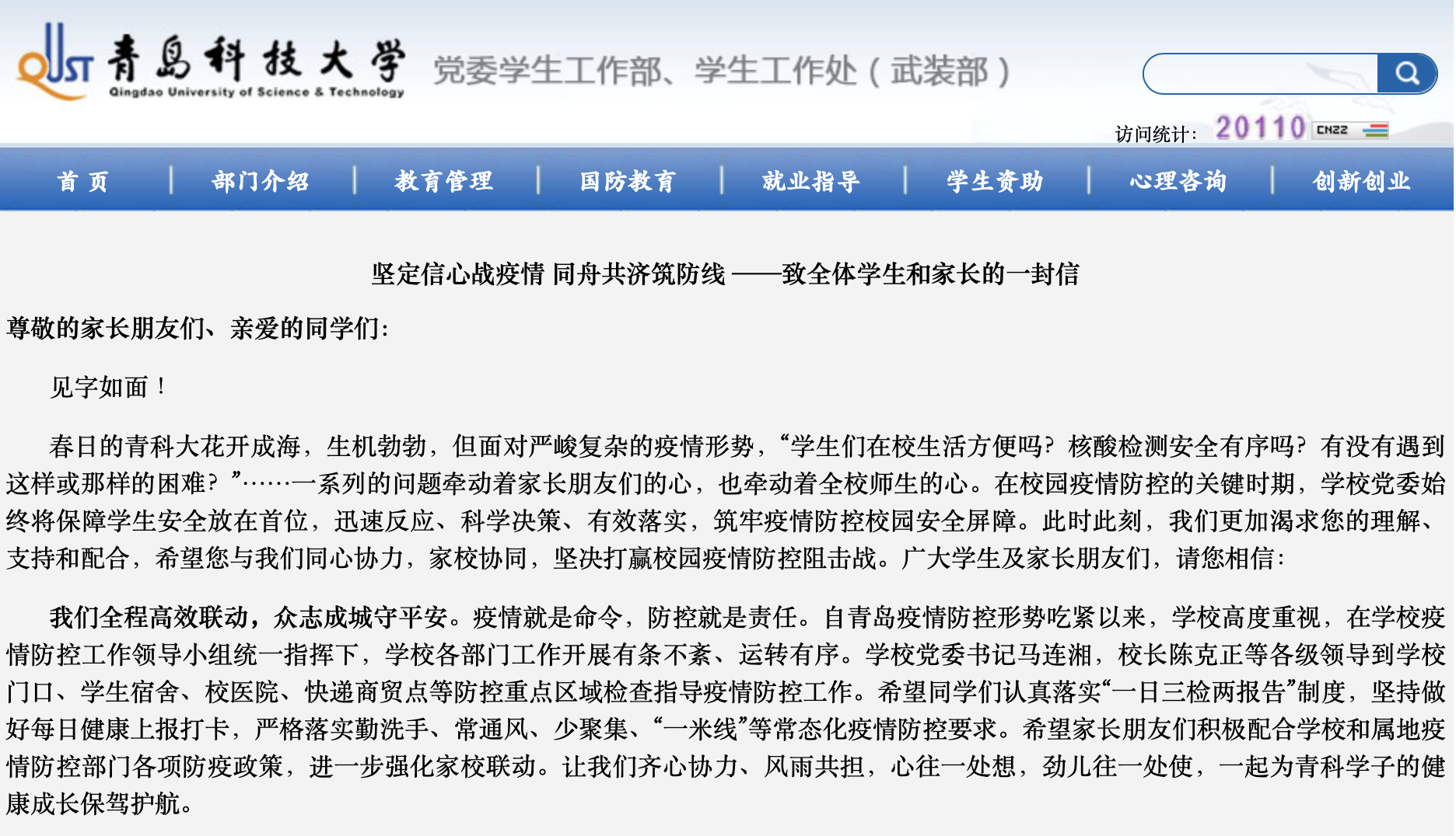采取线上教学和校园封闭管理措施后,学校第一时间发出致全体学生家长的一封信,对学校的疫情防控政策和服务保障措施做出详细说明,让家长迅速知情、放心安心。同时号召家长朋友们积极配合学校和属地疫情防控部门各项防疫政策,引导孩子们顾全大局、严于律己,帮助孩子们疏解压力、调整情绪,鼓励孩子们加强锻炼、志愿服务,共同为青科学子的健康成长保驾护航。
