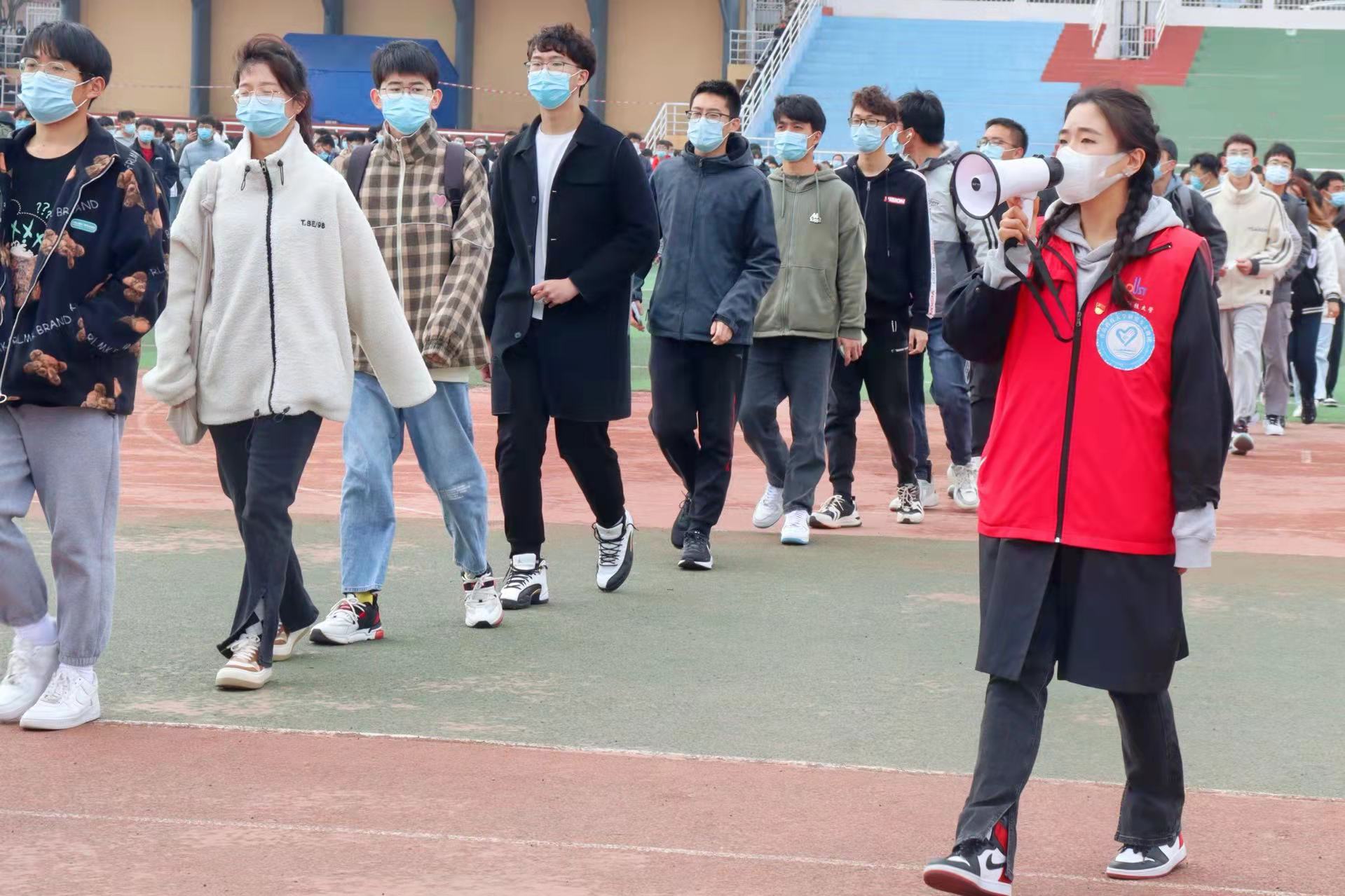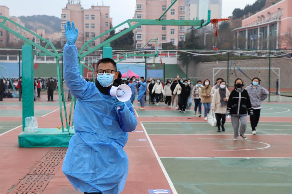 志愿者被分为秩序维护组、检测引导组、信息录入组,两校区每天300人不间断参与服务。机电学院学生王德鹤负责信息的录入和试管标签的粘贴,早晨5点便起床来到操场开始准备工作,厚重的防护服穿脱困难,他便坚持中途少休息。这项工作对耐心和细心要求极高,核酸检测中容不得半点疏忽,时刻紧绷的精神下,他主动顺延三个轮班期,连续工作6小时。脱下密闭的防护服,看着发白的手,王德鹤说:“防护服里除了被汗水湿透的衣服,还有作为青年志愿者火热的心,我们要用实际行动证明,我们已经成长为党和人民可以放心的青年一代”。面对突如其来的疫情,无数学生挺身而出,积极加入到志愿者队伍中。传媒学院学生刘晓阳感慨道:“我特别感动,我觉得这就是志愿服务的奉献精神,这就是我们的科大精神。”当被问到是否需要换班休息一下时,已经维持场内秩序一上午的志愿者果断地摇摇头,坚决地说:“不用,我能坚持。”语罢便跑去引导下一组待测人员,他们全力呼喊着,提醒大家保持一米间隔,寒风下冻僵的双手依旧高举挥舞,略有嘶哑的声音传递着爱和关心。青年志愿者的他们,特别能吃苦、特别能战斗、特别能奉献。