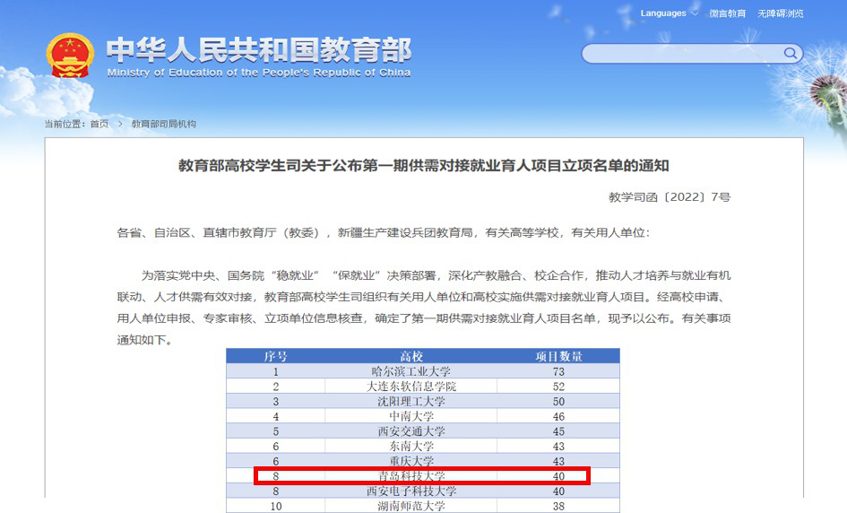日前,教育部发布了《关于公布第一期供需对接就业育人项目立项名单的通知》(教学司函〔2022〕7号),万象城官网就业育人项目立项40个,立项总数在全国立项成功的1268所高校中排名第8位,在山东省内所有高校中排名第1位。