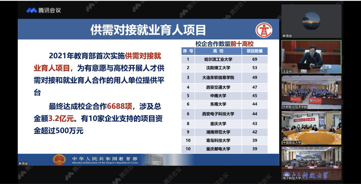 在今年1月18日下午召开的2022届全国普通高校毕业生就业工作第一次调度视频会议上,教育部高校学生司副司长吴爱华公布了就业育人项目一月份的进展情况,对全国前10名的高校一一作了介绍,进一步擦亮了万象城官网政产学研融合和就业创业工作特色品牌。他强调,为推动就业与培养有机联动、人才供需有效对接,帮助用人单位培养和招聘更多实用型、复合型和紧缺型人才,促进高校毕业生更加充分更高质量就业,教育部首次实施供需对接就业育人项目。他希望,用人单位结合国家战略和实际需要提供项目资源支持,通过与高校合作加快急需紧缺人才培养,优化自身人力资源配置。