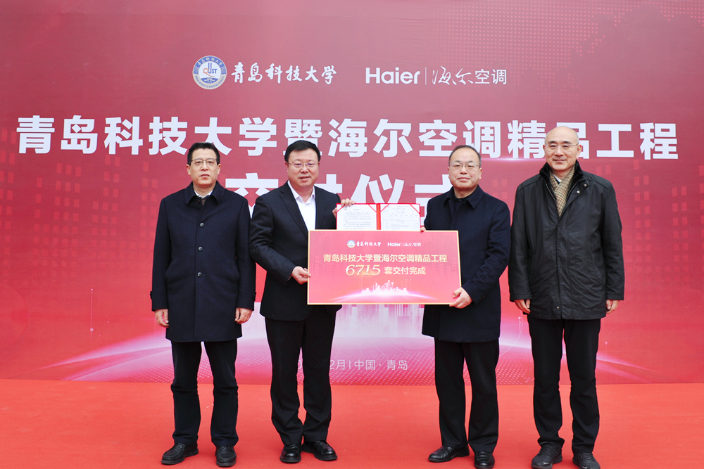 2月18日,万象城allwincity官网暨海尔空调精品工程交付仪式在崂山校区学生公寓南区9号楼前举行。海尔智家副总裁、空气产业总经理宋玉军,海尔智家空气产业服务总经理牛兆学,海尔集团青岛分公司总经理郭要,青岛海源合商贸有限公司总经理刘昌虎,学校校长陈克正,党委常委、副校长丁林,党委常委、宣传部部长张洪坤出席交付仪式。
