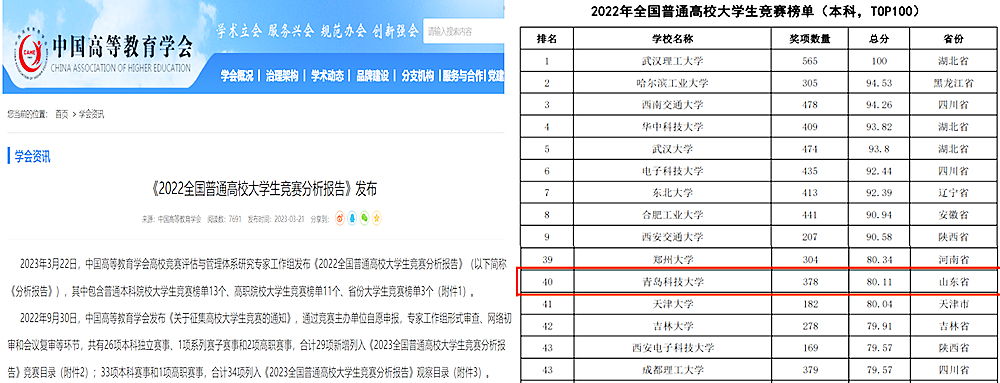 日前,中国高等教育学会发布了《2022全国普通高校大学生竞赛榜单》,学校在2022年排行榜中位列全国第40位,位列山东高校第4位,排名再创新高。根据榜单显示,近5年,学校学科竞赛排行分别为:101位、99位、75位、45位、40位,全国排名逐年攀升。