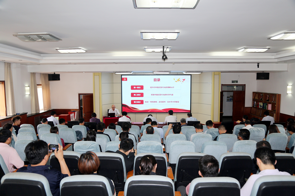 为深入推进学习贯彻习近平新时代中国特色社会主义思想主题教育,教育引导广大党员强化理论学习,更好做到“学思用贯通、知信行统一”,按照学校党委关于主题教育的部署安排,6月20日下午,校长陈克正在高分子学院阿郎新科报告厅为联系单位讲授主题教育专题党课。党委(校长)办公室相关负责人、人事处和审计处所有党员,高分子学院全体教工党员参加党课。党课由高分子学院党委书记孙洪广主持。