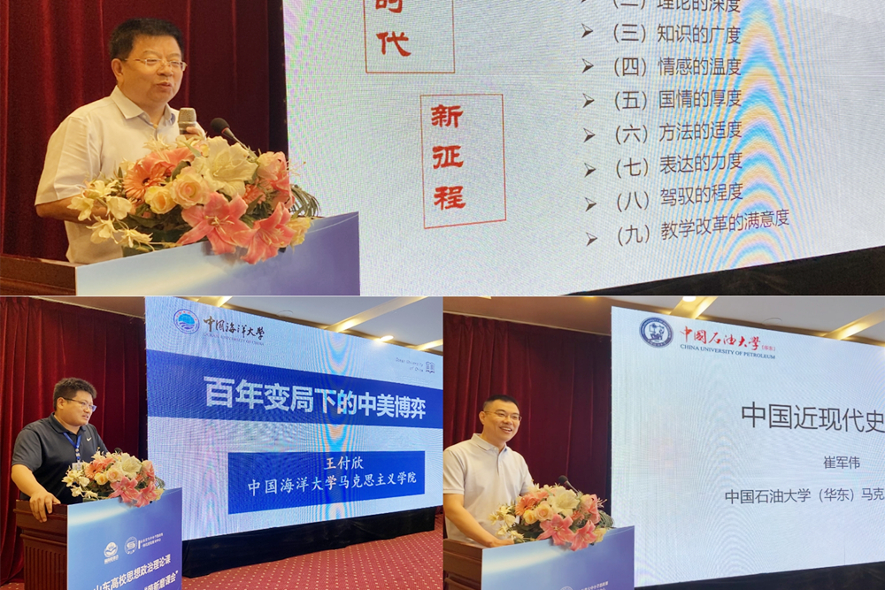 中央马工程首席专家、教育部高校思政课教学指导委员会概论课副主任委员、兰州大学刘先春教授以《如何讲好思想政治理论课》为题进行专家辅导,从政治高度、理论深度、知识广度、情感温度、国情厚度、方法适度、表达力度、驾驭程度与教学改革满意度九个方面对讲好思政课提出要求。全国思政课教学展示二等奖获得者、中国海洋大学马克思主义学院副院长、副书记、教授王付欣,全国思政课教学展示一等奖获得者、中国石油大学(华东)马克思主义学院副院长、副教授崔军伟分别作了教学示范展示。