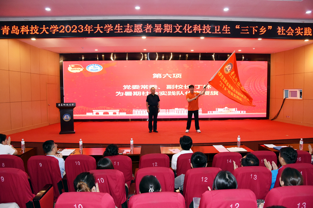 丁林为暑期社会实践队代表授旗,并向参加“三下乡”社会实践的青年学生和实践队提出四点希望:一是在实践中做到学以致用。希望同学们能向习近平总书记学习,既要攻读“有字书”,也要钻研“无字书”,通过理论普及宣讲、乡村振兴促进、发展成就观察、党史学习教育、民族团结实践等多种形式,把两者融会贯通,学以致用、用以促学,让信念更坚定,让眼界更长远,让胸襟更开阔,真正读深读透“社会实践”这本大书。二是在实践中敢于勇担重任。希望同学们结合自身专业知识和技能,在经济发展、科技创新、文化教育、民主法治、乡村振兴、社会治理、美丽中国建设等各领域各方面的实践中迸发创新热情和创造勇气,把在学校学到的本领展现在科技攻关最前沿、经济建设主战场、乡村振兴主阵地、创新创业第一线,真正描实绘清我们“青科大人的样子”。三是在实践中发扬斗争精神。希望同学们在精神上敢于斗争,在基层实践的大风大浪、艰难困苦中自觉磨砺“科大精神”“橡胶品格”,勇于战胜一切困难;在行动上善于斗争,全面学习领会习近平新时代中国特色社会主义思想的科学体系、精髓要义、实践要求,在应对重大挑战、抵御重大风险、克服重大阻力、解决重大矛盾中经风雨、见世面、壮筋骨、长才干,让青春在强国建设、民族复兴的火热实践中绽放绚丽之花。四是在实践中保持奋斗激情。希望同学们在实践中“自找苦吃”,时刻保持奋斗激情,真正把身子俯下来、沉下去,真正用脚步丈量祖国大地,用眼睛发现中国精神,用耳朵倾听人民呼声,用内心感应时代脉搏,自觉把“小我”的青春奋斗融入“大我”的时代洪流之中,扎实奋斗、艰辛奋斗、团结奋斗,以奋勇争先的姿态答好新时代“青年新答卷”。