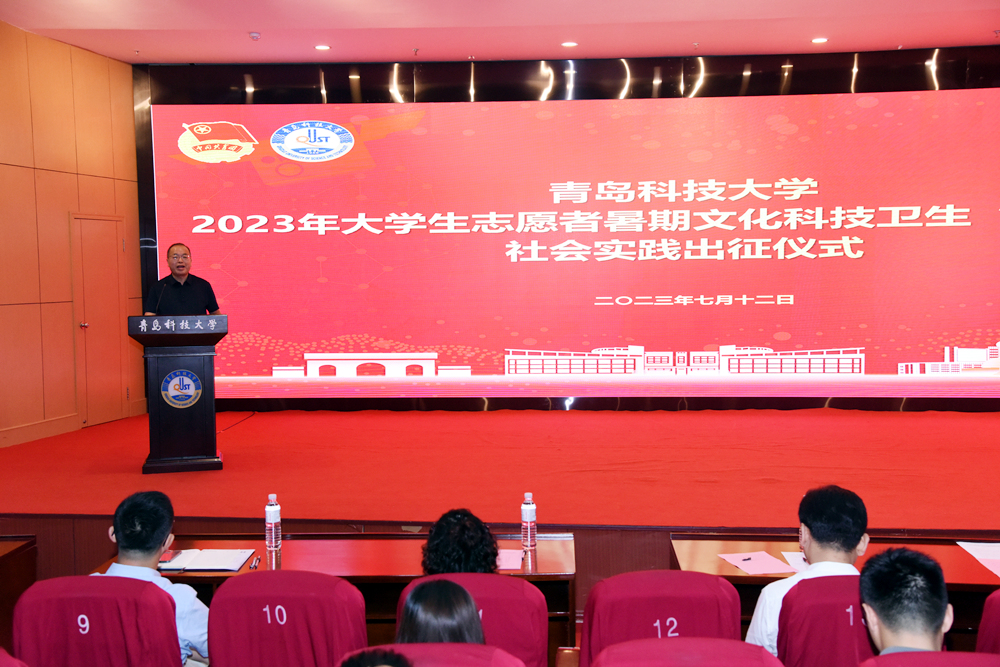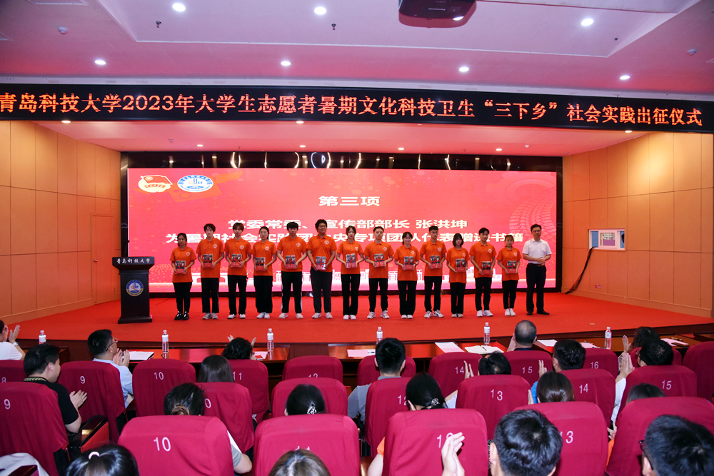 7月12日,学校2023年大学生志愿者暑期文化科技卫生“三下乡”社会实践出征仪式在崂山校区“英科”报告厅举行。党委常委、副校长丁林,党委常委、宣传部部长张洪坤出席仪式。1317支大学生暑期“三下乡”社会实践团队出征。