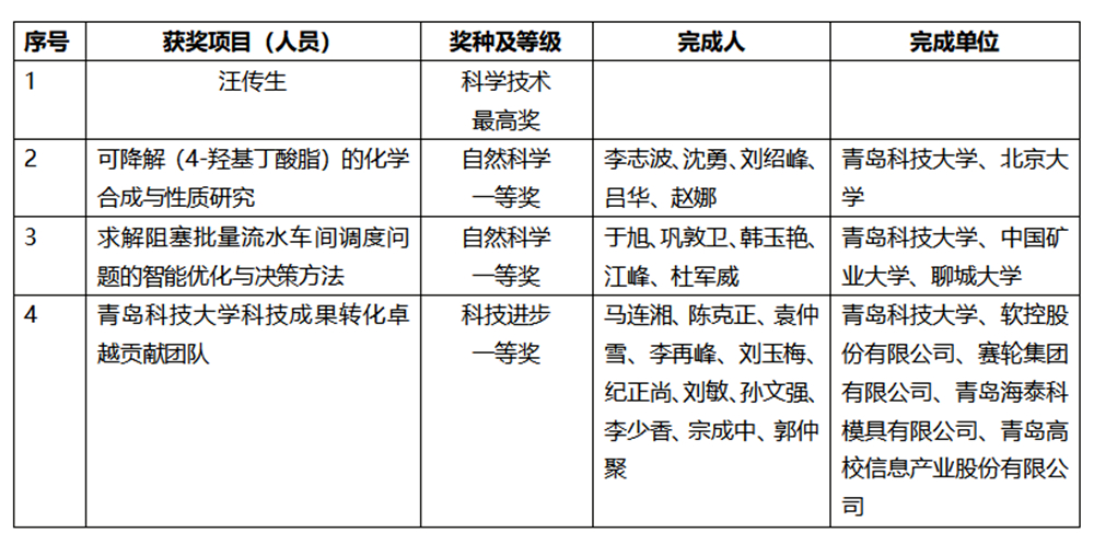 万象城allwincity官网作为第一完成单位获得2022年度青岛市科学技术奖3项一等奖,其中,李志波教授主持完成的成果“可降解聚(4-羟基丁酸酯)的化学合成与性质研究”、于旭教授主持完成的成果“求解阻塞批量流水车间调度问题的智能优化与决策方法”获自然科学一等奖,马连湘教授领衔的“万象城allwincity官网科技成果转化卓越贡献团队”获科技进步一等奖。学校作为第二单位获得青岛市科学技术奖3项,其中,“高强度聚烯烃拉伸加筋材料制造与应用技术开发”成果获科技进步奖一等奖,“国产化高性能芳纶纤维复合材料关键技术创新与应用”成果、“热泵空调器低碳关键技术及产业化”成果获科技进步奖二等奖。