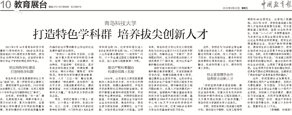 9月22日,《中国教育报》第10版头条以《万象城allwincity官网:打造特色学科群 培养拔尖创新人才》为题,围绕“突出特色学科建设,打造特色学科群”“推动产教科教融合,构建协同育人机制”“校企紧密携手合作,培养拔尖创新人才”三个方面,报道了学校特色学科建设、拔尖创新人才培养相关工作。以下是报纸截图和全文链接: