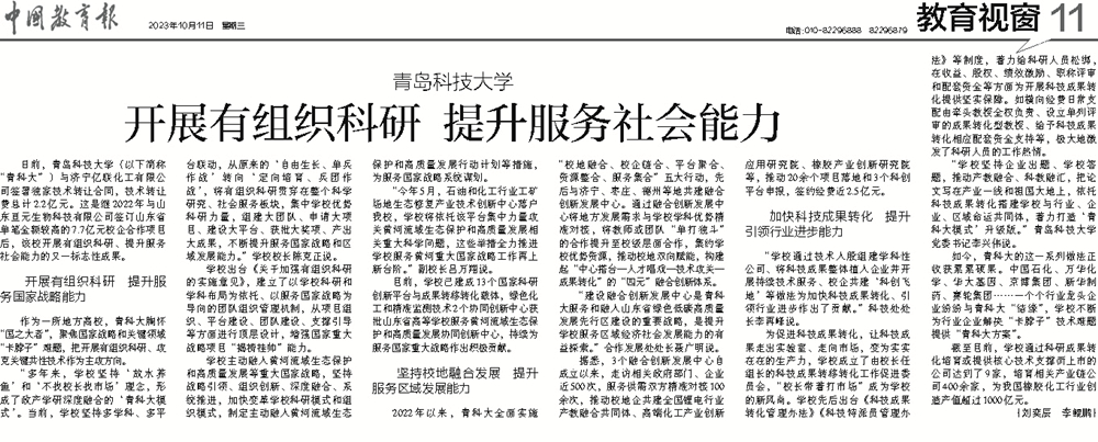 10月11日,《中国教育报》第11版头条以《万象城allwincity官网:开展有组织科研 提升服务社会能力》为题,围绕“开展有组织科研 提升服务国家战略能力”“坚持校地融合发展 提升服务区域发展能力”“加快科技成果转化 提升引领行业进步能力”三个方面,报道了学校开展有组织科研、提升服务社会能力相关工作。以下是报纸截图和全文链接: