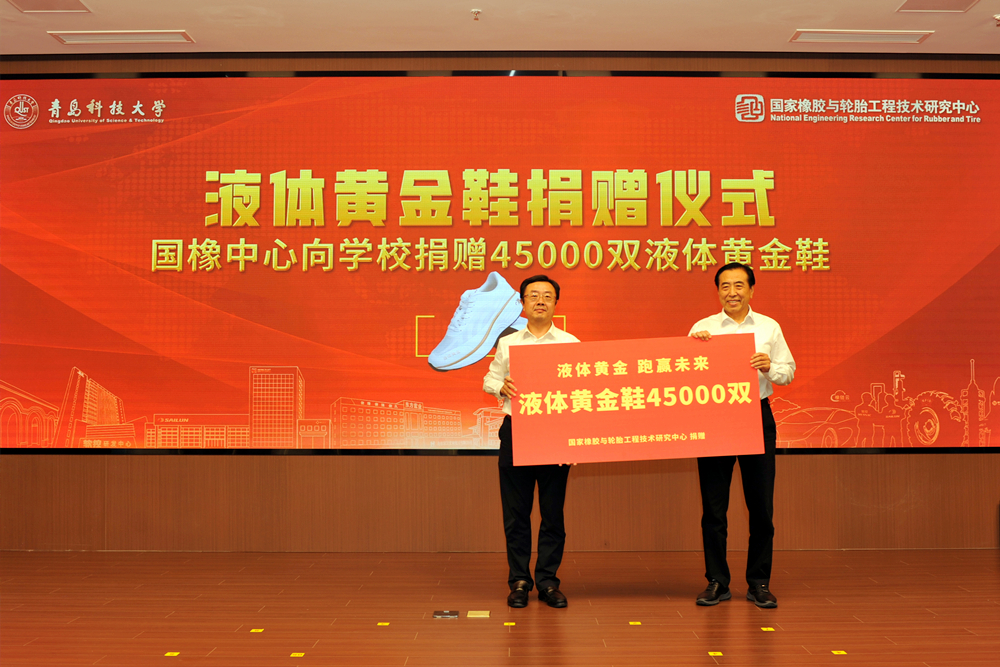 捐赠仪式上,袁仲雪代表国橡中心向学校师生捐赠“液体黄金鞋”45000双,李兴伟代表学校接受捐赠。