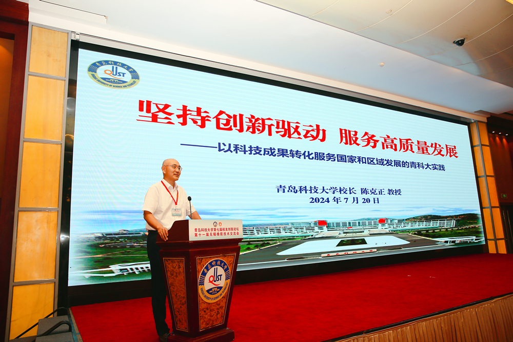 陈克正作了题为《坚持创新引领服务高质量发展——以科技成果转化服务国家和区域发展的青科大实践》的主题报告,介绍了学校历史沿革,办学特色,重点报告了学校在服务国家战略、服务区域发展、引领行业进步发展战略指标下,不断加强有组织科研、有组织社会服务,深化校地融合、成果转化等方面的工作探索以及取得的工作成效。