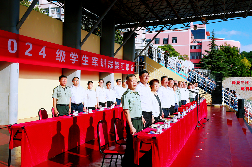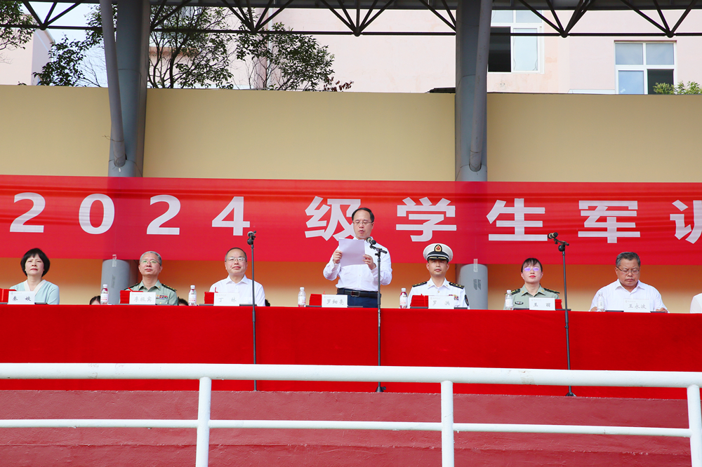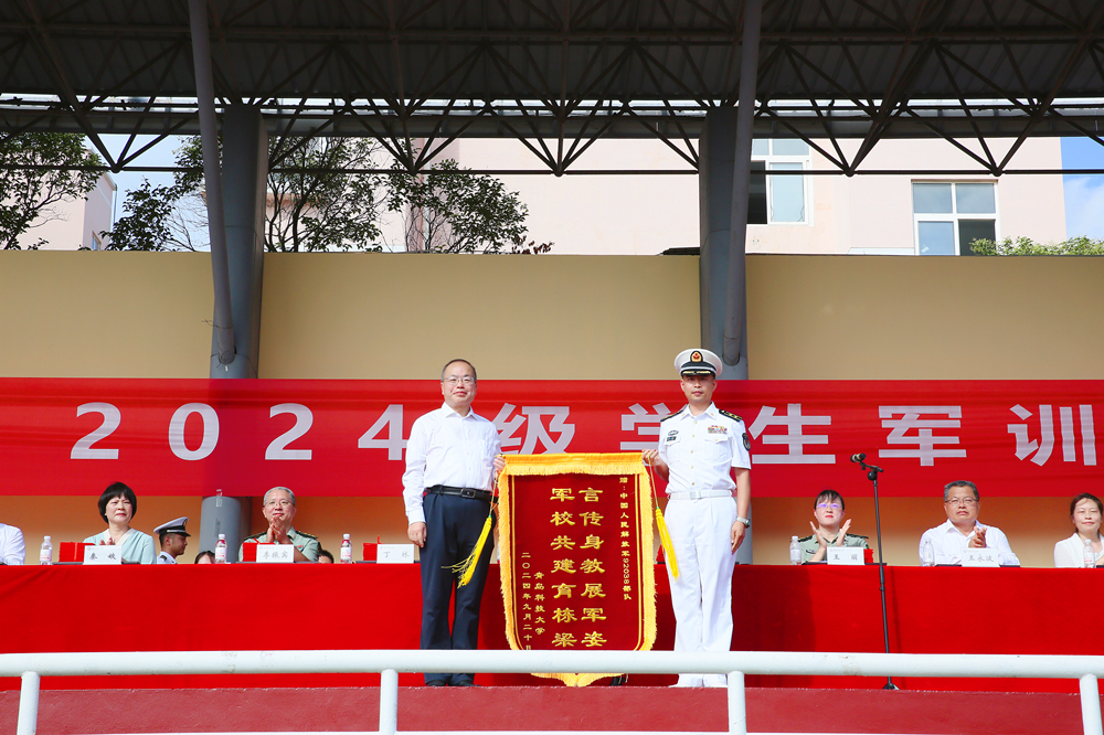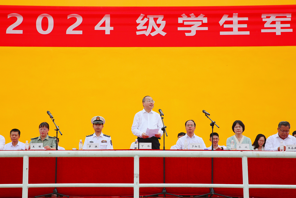 丁林向承训部队赠送锦旗,并代表学校向圆满完成军训任务的2024级新生表示祝贺,向所有教官和带训辅导员表示感谢。丁林向所有参训学生提出五点希望:一是坚持自律和主体性,要珍惜时间,珍惜光阴,珍惜大学时光;二是明确大学发展目标及人生目标,提升专业素质和人文素养,努力成人、成长、成才;三是增强学习力、行动力、生存力、发展力,勇毅前行,奋力前进,求真学问,练真本领,德智体美劳全面而融合发展;四是自我负责,自我教育,始终保持并发扬通过军训养成的起居有序的生活习惯、令行禁止的纪律意识和永不言弃的拼搏精神,超越自我、成就自我,成就他人,成就美好世界;五是健康身心,做人生的自强者,自理自信自强、自尊自爱自强,勇于探寻生命真谛,安全安康安定。