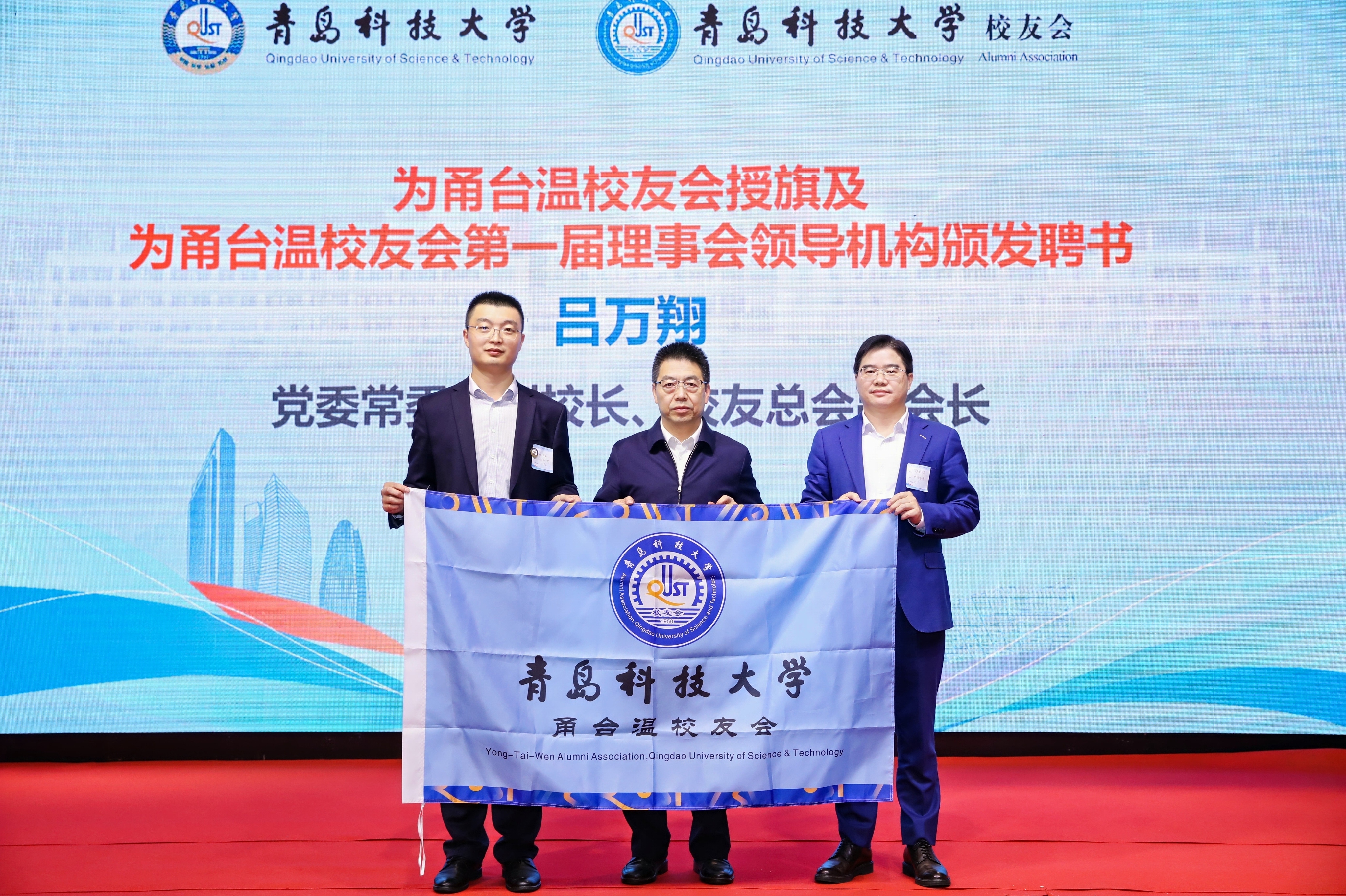 吕万翔为甬台温校友会授旗,并向甬台温校友会第一届理事会领导机构颁发聘书。
