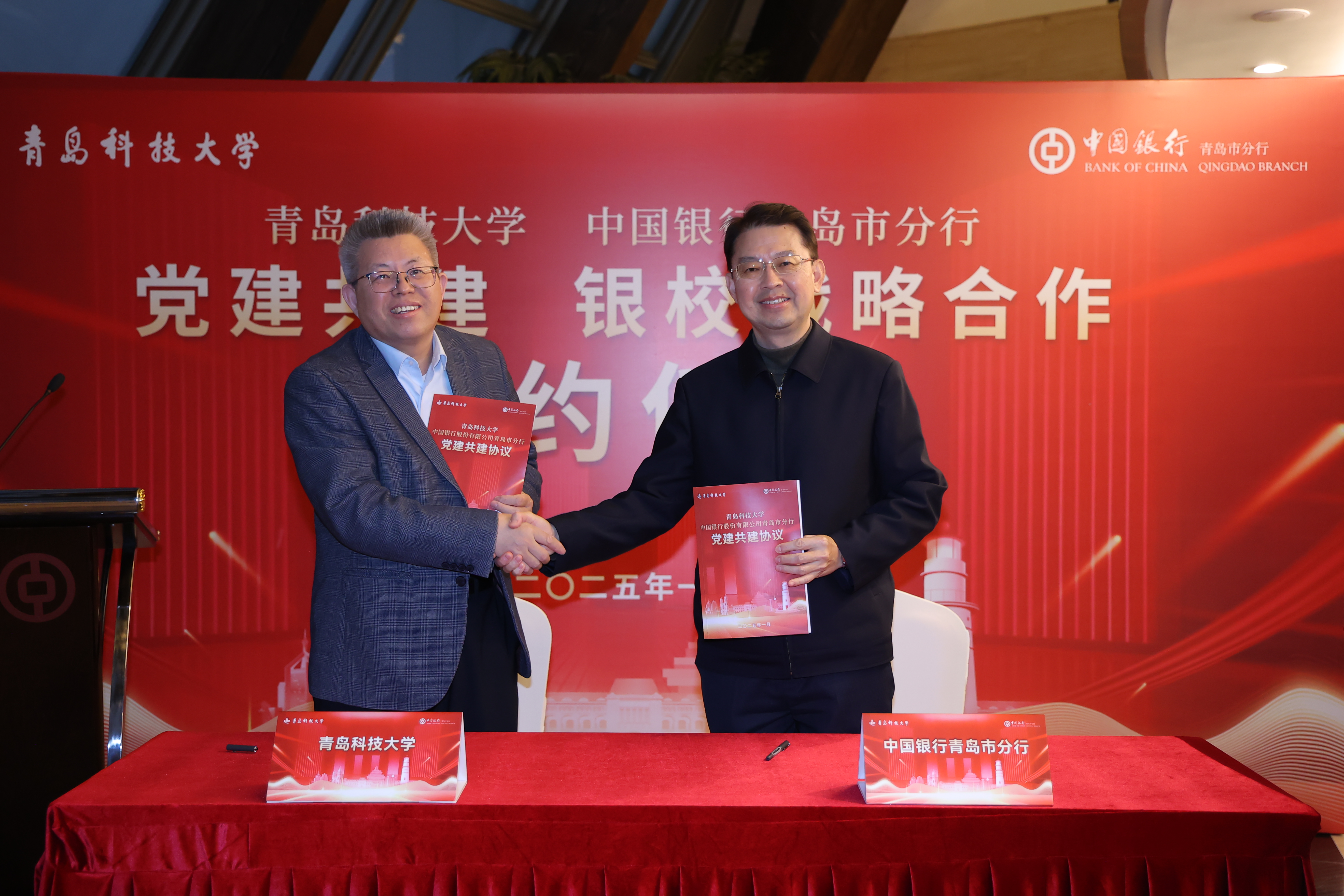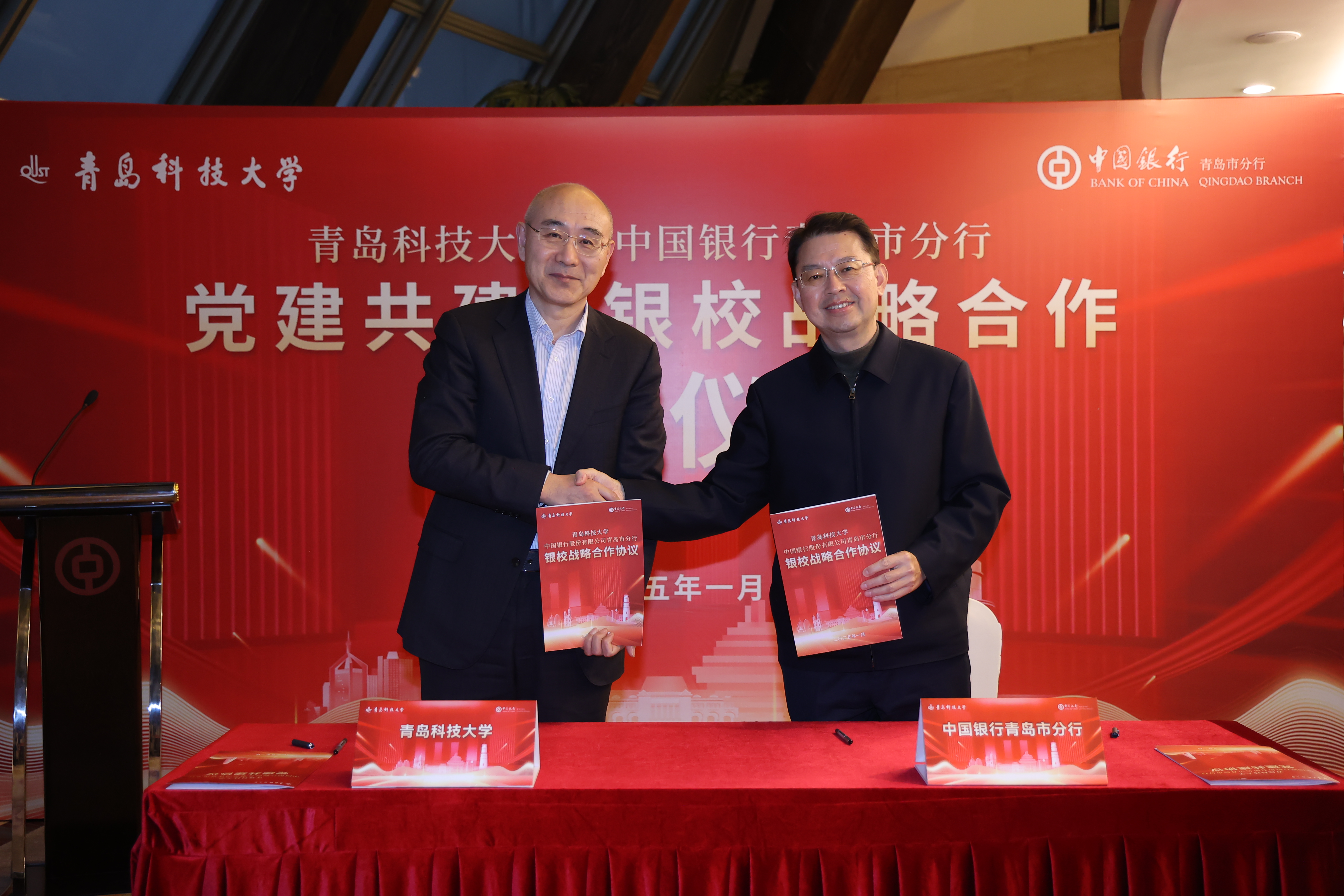 1月13日,万象城allwincity官网与中国银行青岛市分行党建共建、银校战略合作协议签订仪式在青岛国际金融中心举行。学校党委书记杨天梅,校长陈克正,党委常委、副校长吕万翔,中国银行青岛市分行党委书记、行长闫华,党委委员、副行长张屹东、高楠出席签约仪式。