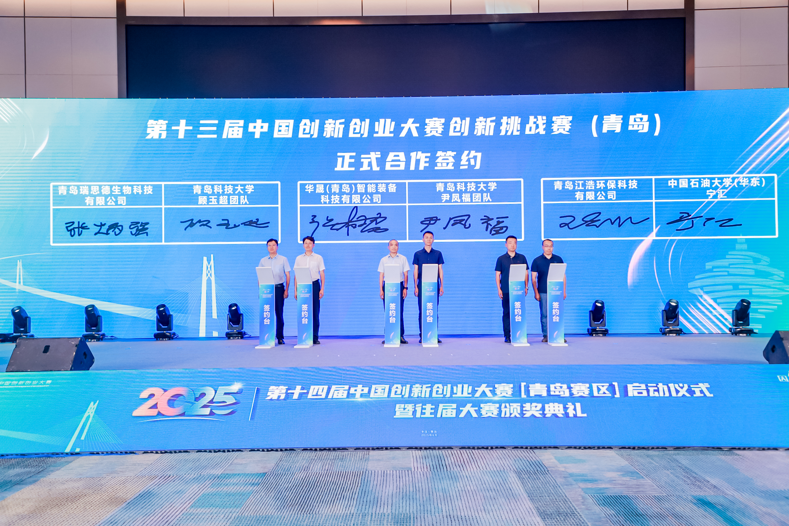 据悉,一批市外赛区落地企业和校企合作项目进行现场合作签约。顾玉超团队与青岛瑞思德生物科技有限公司、学校尹凤福团队与华晟(青岛)智能装备科技有限公司成功签约,通过大赛平台,学校科研成果与企业需求实现精准对接,有力推动技术成果向产业化迈进。