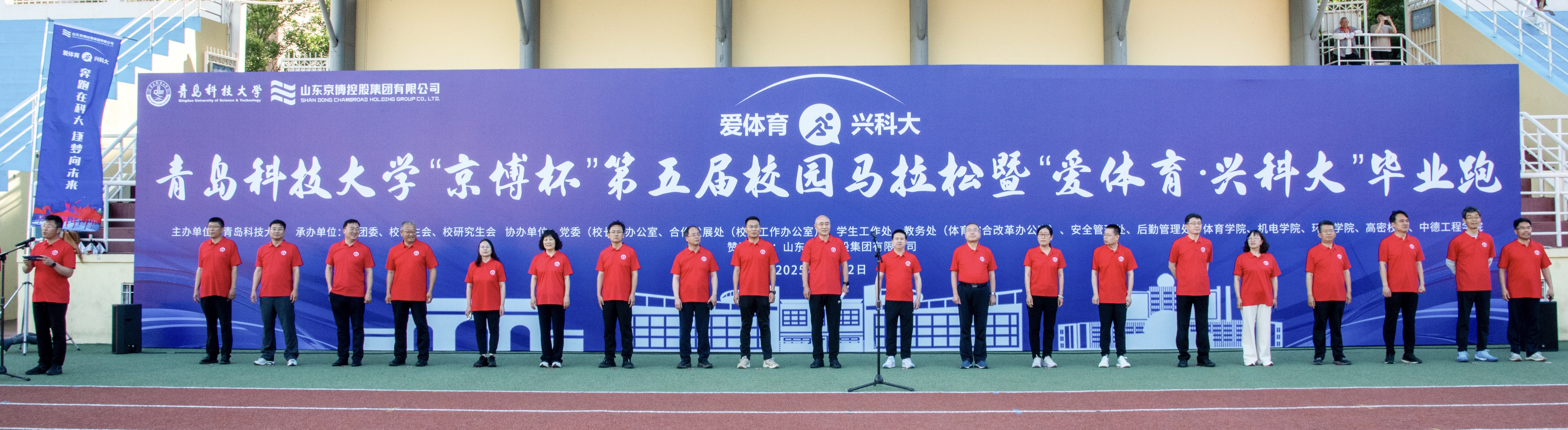 与会领导、嘉宾共同为校园马拉松和毕业跑运动员发放物资礼包,山东京博控股集团有限公司代表致辞,裁判员代表进行比赛宣誓,毕业生代表发言表达了对母校辛勤培育的感激和留恋。