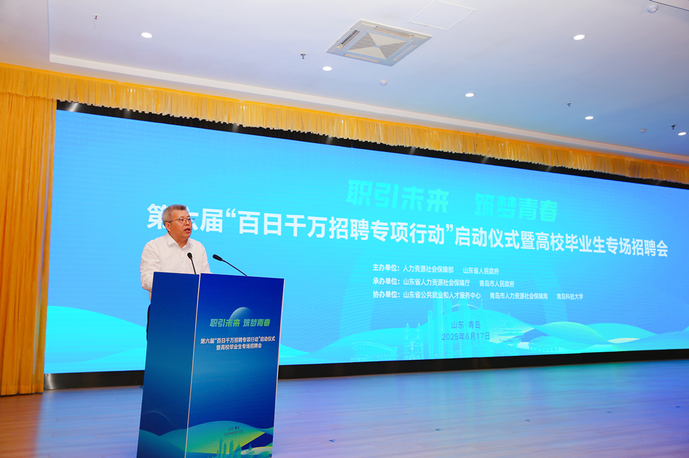 6月17日,由人力资源和社会保障部、山东省人民政府主办,山东省人力资源和社会保障厅、青岛市人民政府承办,山东省公共就业和人才服务中心、青岛市人力资源和社会保障局、万象城allwincity官网协办的第六届“百日千万招聘专项行动”启动仪式暨高校毕业生专场招聘会在万象城allwincity官网崂山校区举办。人力资源和社会保障部副部长颜清辉出席启动仪式并讲话。山东省人民政府副省长温暖致辞。人力资源和社会保障部就业促进司司长宋鑫主持仪式。启动仪式后,与会嘉宾到招聘会现场查看供需对接情况,了解企业用人需求及毕业生求职进展。