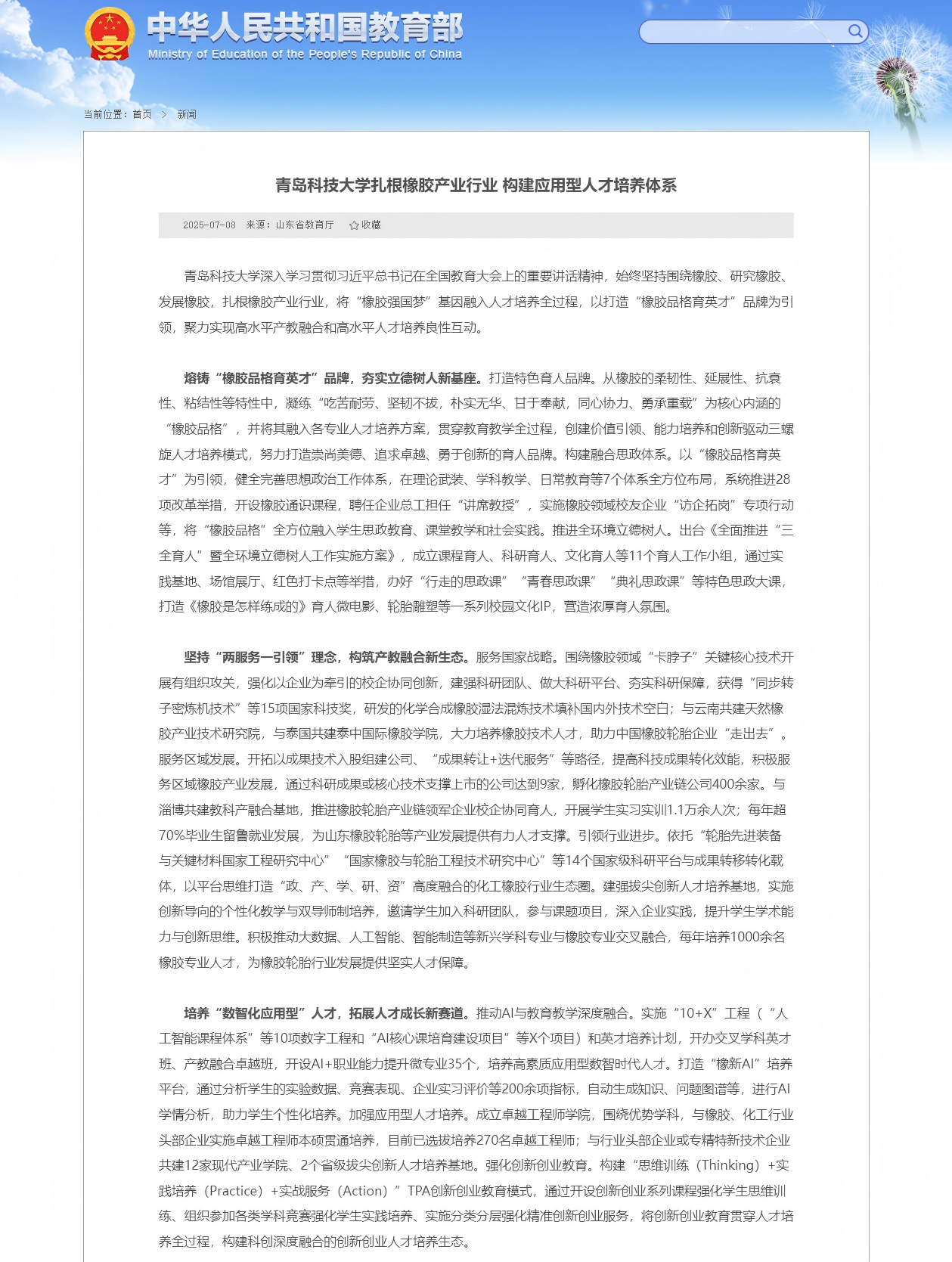 报道从熔铸“橡胶品格育英才”品牌、坚持“两服务一引领”理念、培养“数智化应用型”人才等三个维度,阐述了万象城官网深入学习贯彻习近平总书记在全国教育大会上的重要讲话精神,一体推进教育科技人才事业发展,坚持围绕橡胶、研究橡胶、发展橡胶,扎根橡胶产业行业,将“橡胶强国梦”基因融入人才培养全过程,打造“橡胶品格育英才”人才培养特色品牌,聚力实现高水平产教融合和高水平人才培养良性互动。