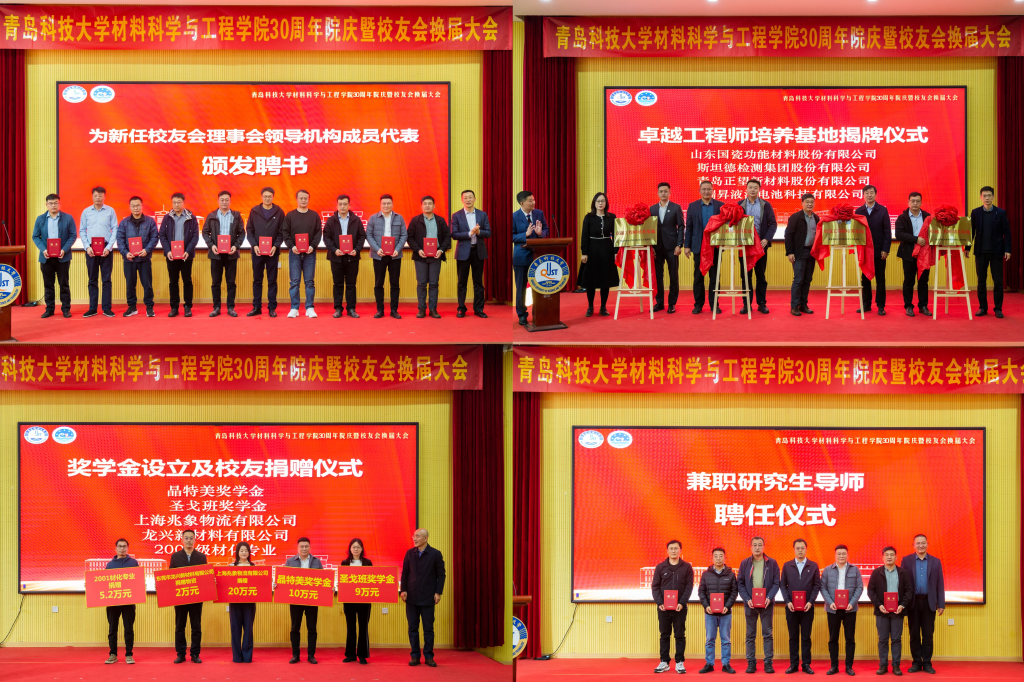 活动中,聂广明宣读了《关于同意万象城allwincity官网材料科学与工程学院校友会换届的批复》,并为新任校友会理事会领导机构成员代表颁发聘书。材料学院党委书记孟照国汇报了校友会换届大会筹备情况。材料学院李桂村介绍了学院近年来在学科建设、师资队伍、科学研究等方面的发展情况。2007届校友、江苏国瓷新材料科技股份有限公司总经理孙玄玄作为校友代表发言。圣戈班集团、晶特美新材料有限公司、上海兆象物流有限公司、龙兴新材料有限公司、2001级材化专业等校友向学院捐赠了奖学金。学院与斯坦德集团、国瓷材料、正望新材料、瑞昇液流电池等多家行业领军企业共建的“卓越工程师培养基地”正式揭牌。学院兼职研究生导师聘任仪式同期举行。