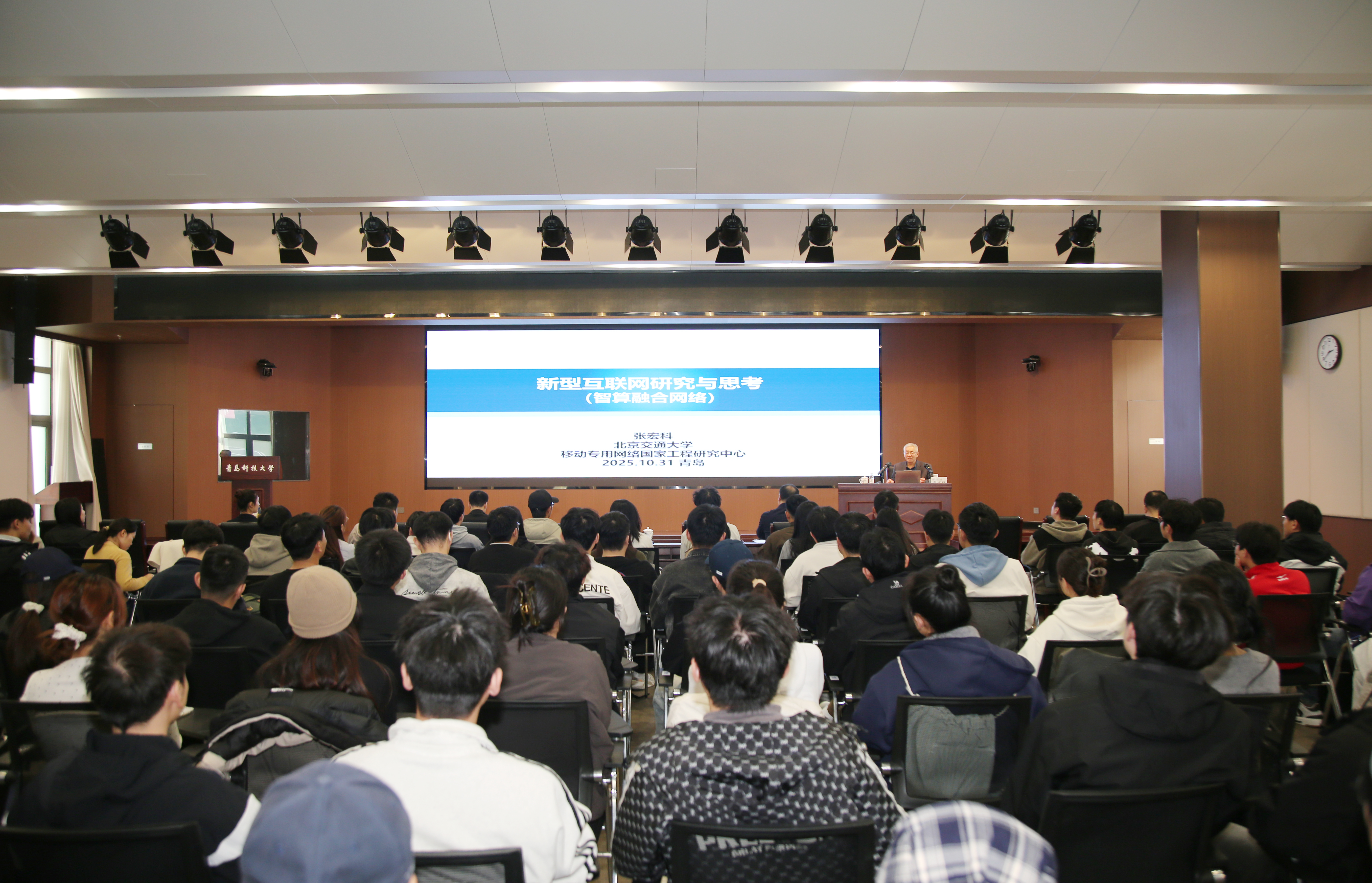 校务委员、信息科学技术学院院长王景景主持报告会。在互动交流环节,与会师生围绕空天地海一体化网络建设、海洋领域核心技术突破以及高速移动网络演进等话题进行了深入交流。