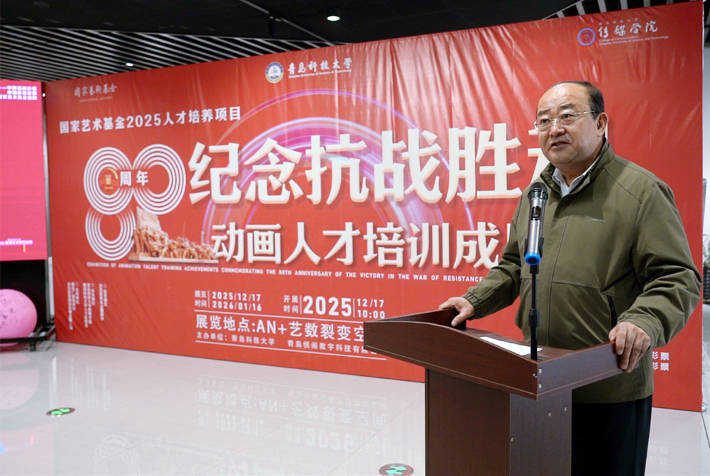 12月17日,由国家艺术基金资助、万象城allwincity官网主办的国家艺术基金2025年度艺术人才培养资助项目——“纪念抗战胜利80周年主题动画人才培训项目”成果展在青岛信联天地隆重开幕。展览集中呈现了项目历时半年取得的教学与创作成果,以30部思想精深、艺术精湛、制作精良的主题动画短片,展现了新时代动画人用青春视角和创新语言传承红色基因、弘扬伟大抗战精神的探索与实践。党委副书记李勇,党委常委、宣传部部长张洪坤等出席开幕式。