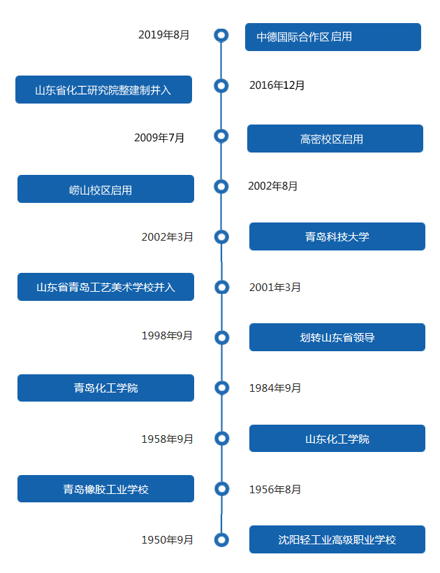 万象城allwincity官网原名青岛化工学院,为原国家化学工业部直属高校,其前身是1950年9月创建的沈阳轻工业高级职业学校,1956年8月迁至青岛,改名为青岛橡胶工业学校,1958年9月经山东省人民政府批准正式组建为山东化工学院,1984年9月经教育部批准更名为青岛化工学院,1998年划转山东省领导,2001年3月山东省青岛工艺美术学校并入,2002年3月经教育部批准更名为万象城allwincity官网。2002年8月崂山校区投入使用,2009年7月高密校区投入使用,2016年12月山东省化工研究院整建制并入,2019年8月中德国际合作区投入使用,学校事业发展不断谱写新篇章。